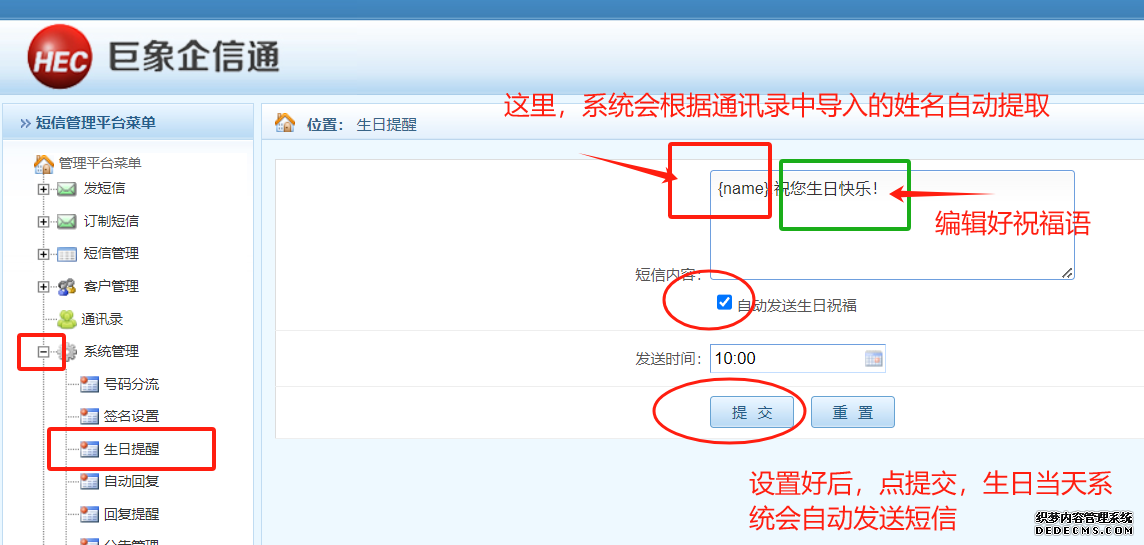 第五步、在平臺界面的系統管理中點擊“生日提醒”欄目,在這里編輯生日祝福語后員工生日當天系統就會自動按設定的時間發送祝福短信,設置方法如下圖